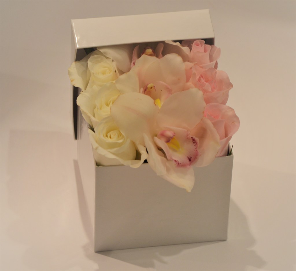 This fresh modern design of beautiful white and pink roses, and white and pink cymbidium orchids in a white square box, was constructed for the lovers of contemporary look.